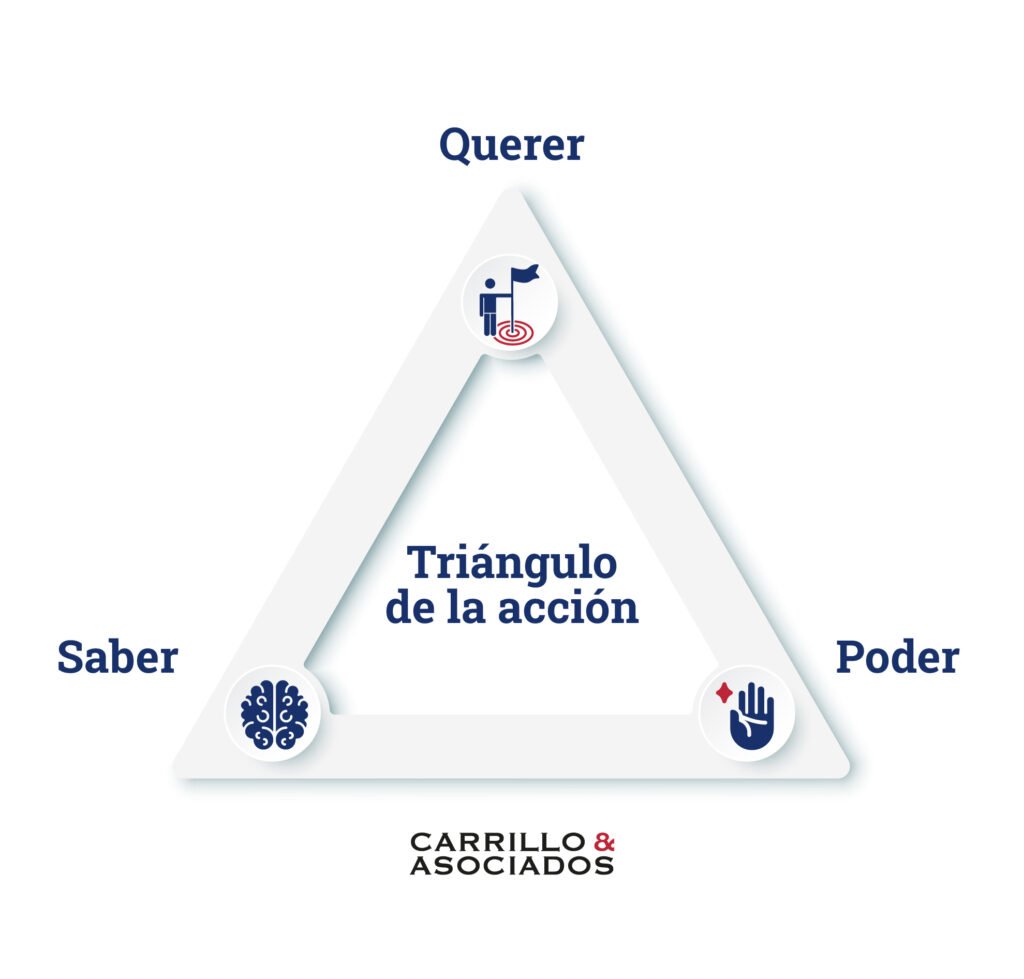 En mi experiencia, al momento de fijar objetivos suelo tener siempre presente el Triángulo de Acción, donde se unen los conceptos de querer, saber y poder.