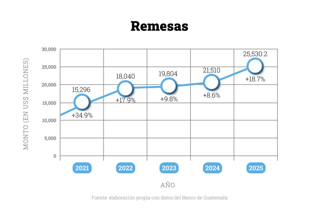 Guatemala cerró 2025 con un crecimiento económico del 4.1%. El consumo privado, las inversiones y las exportaciones jugaron un papel importante en estas cifras, pero si hay un factor que parece que estuvo por encima de las expectativas fueron las remesas, que en 2025 crecieron un 18.7% con respecto al año anterior.