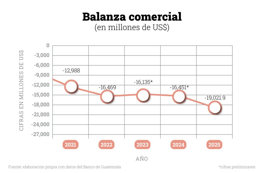 Durante 2025, las exportaciones y las importaciones de Guatemala aumentaron un 7.1% y un 6.5% respectivamente. Como ha sido la norma, la balanza comercial de Guatemala sigue siendo negativa, debido a que las importaciones, que alcanzaron US$34.6 millardos, superan por un amplio margen a las exportaciones, que apenas son de US$15.58 millardos. Es importante destacar que este año la brecha comercial ha sido más amplia con respecto a los últimos años.