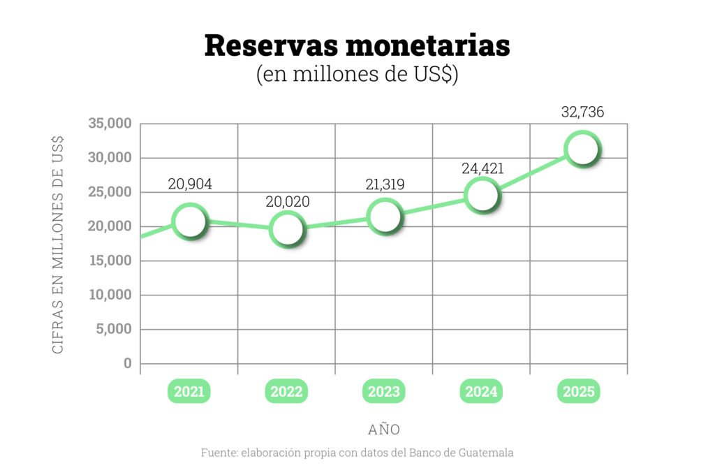 A diciembre de 2025 las reservas monetarias de Guatemala superaron los US$32 mil 700 millones, lo que supone un aumento de más de US$8 mil millones (+34%) con respecto al mismo periodo de 2024. De acuerdo con el presidente del Banguat, Álvaro González Ricci, es consecuencia de que el país ha recibido más dólares de los que requiere el mercado cambiario. Estos provienen principalmente de las remesas, las exportaciones y un Eurobono que el país colocó durante 2025. Esto fortalece la posición del país para hacer frente a sus obligaciones a corto plazo en caso de ser necesario.